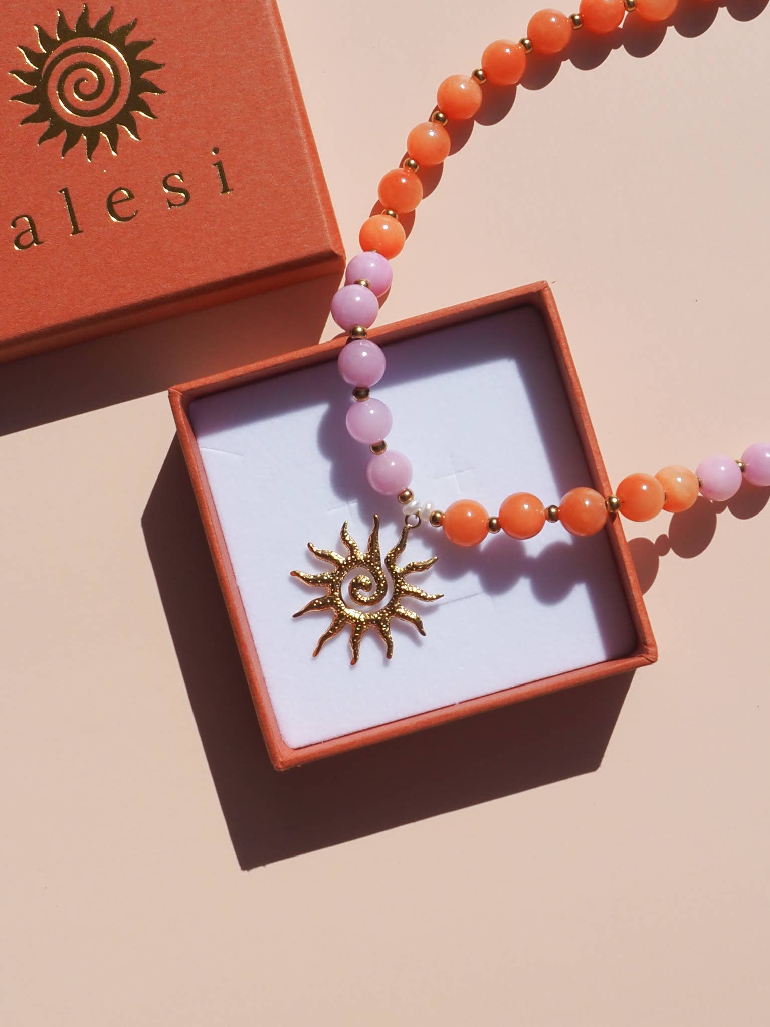 Spiral Sun Pink & Orange Beaded Gemstone Necklace
