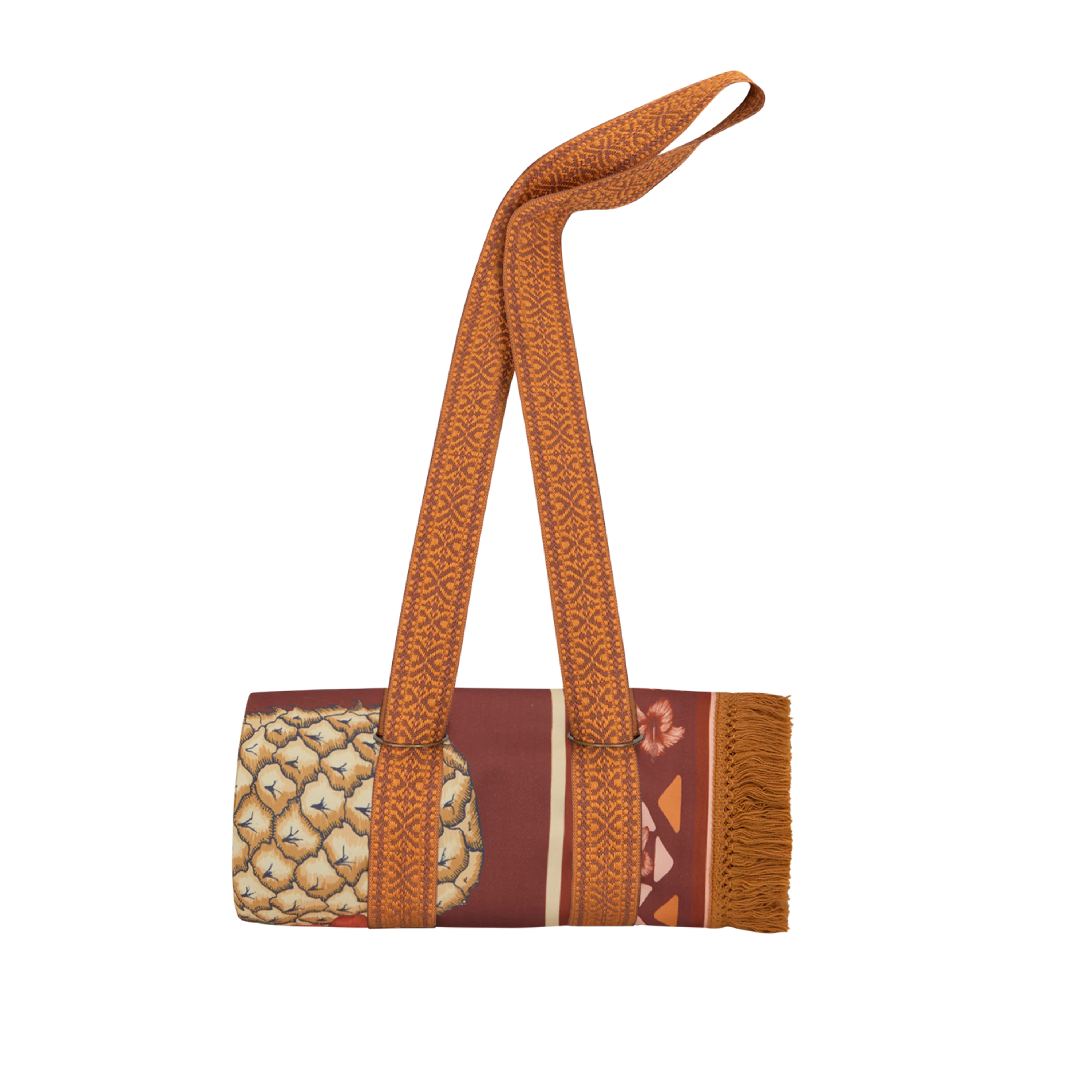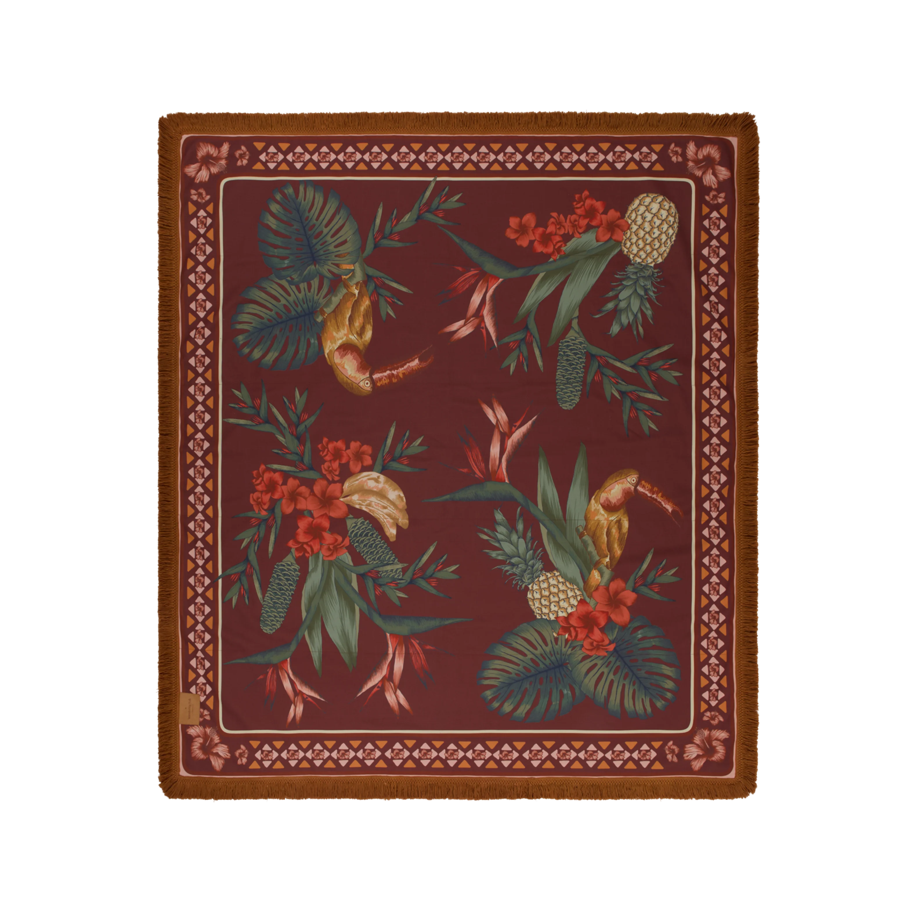 Featuring a hand-drawn, vintage Cuban-inspired floral design. Bursting with tropical charm and nostalgic flair, toucans, pineapples, and bird of paradise bloom across fabric made from recycled PET (plastic bottles) rich browns, jungle greens with highlights of coral reds. Edges of picnic rug have a dark brown cotton fringe for that vintage feel.