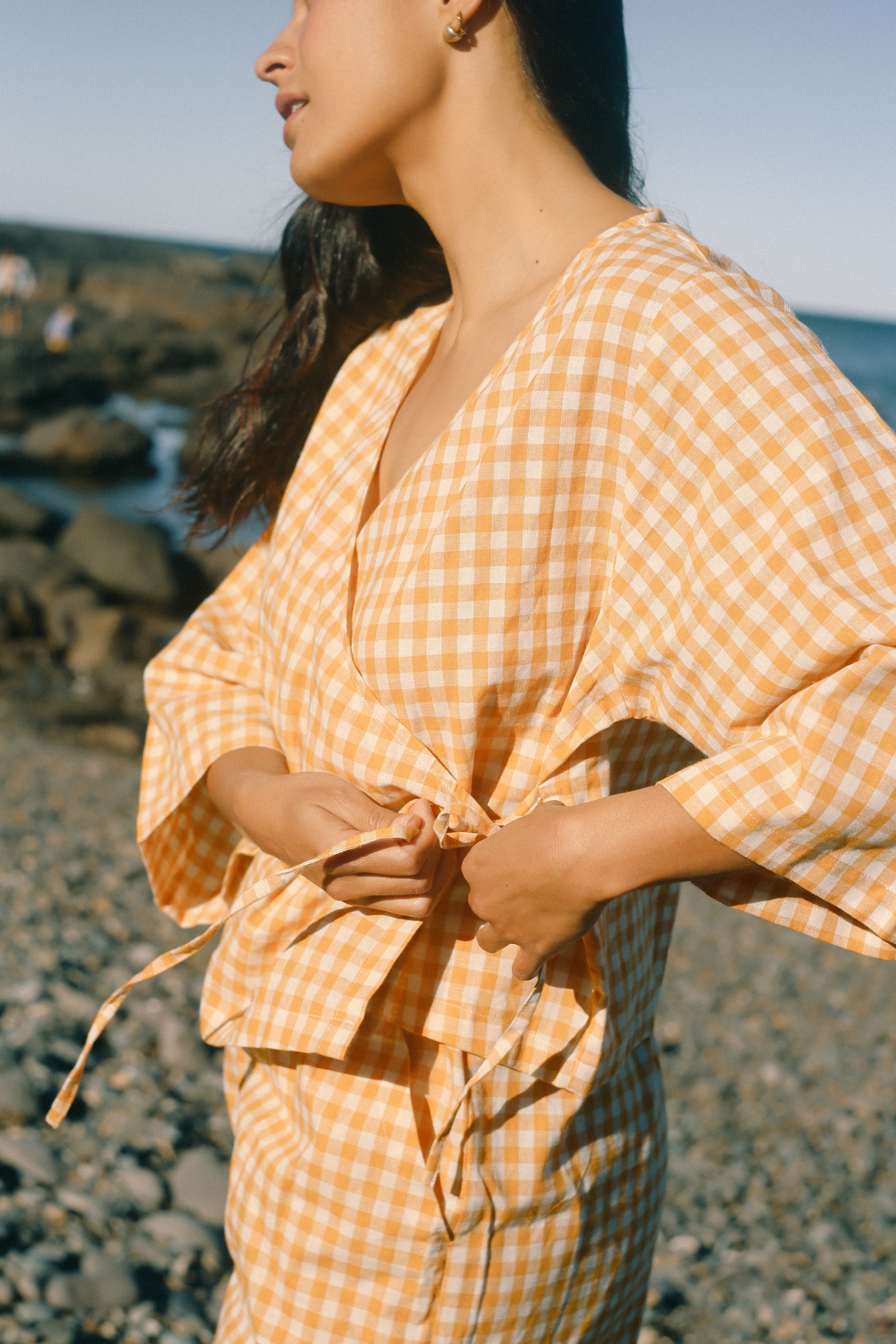 Crafted from a breathable 30% Linen and 70% Cotton blend in our sweet Clementine Gingham, this textured gingham fabric is soft, breathable, and light, ideal for carrying you through the warmer months with ease.