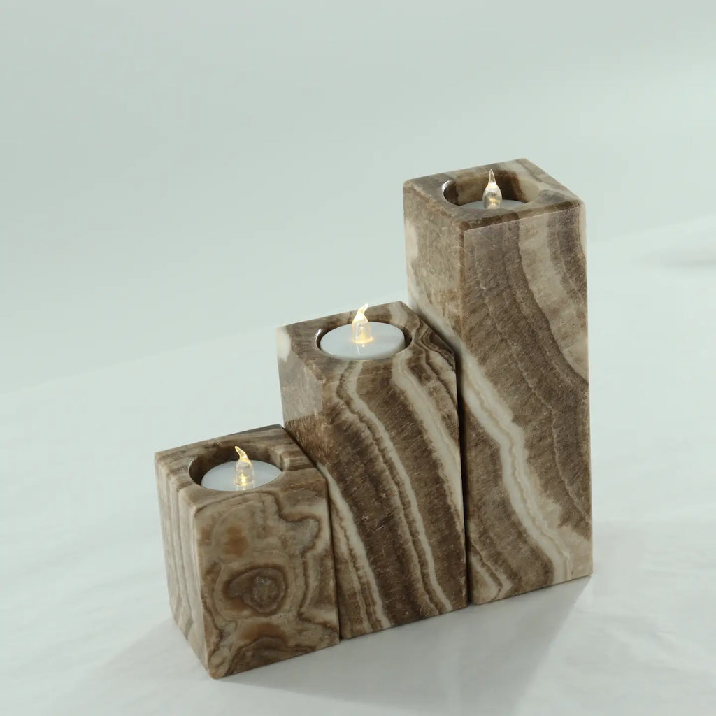 Warm and grounding, this set of three tealight holders is hand-carved from natural chocolate onyx, each piece revealing its own unique layers of caramel, cream, and deep cocoa tones. When lit, the soft glow of candlelight filters through the stone, highlighting its organic patterns and creating a tranquil, earthy ambiance.