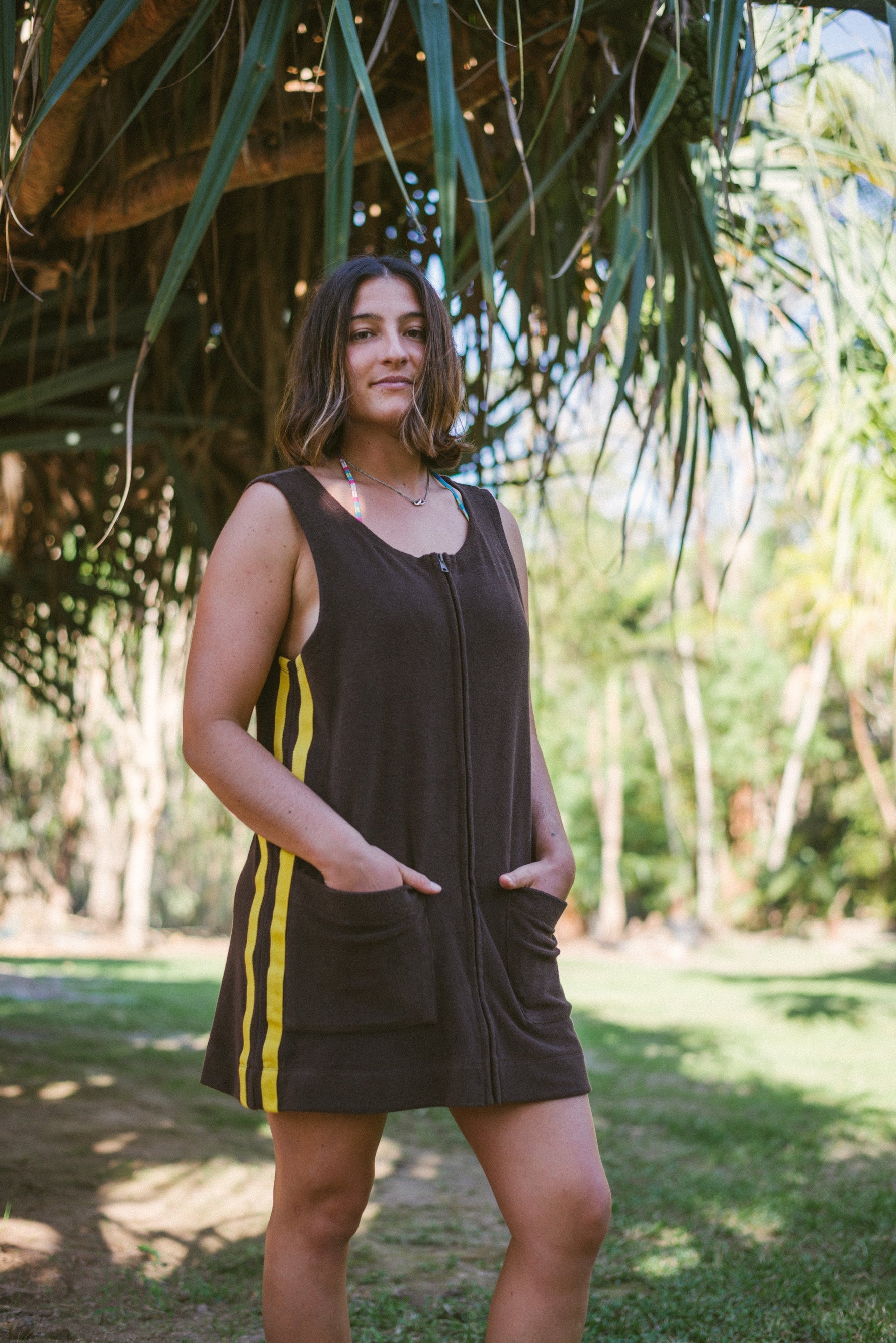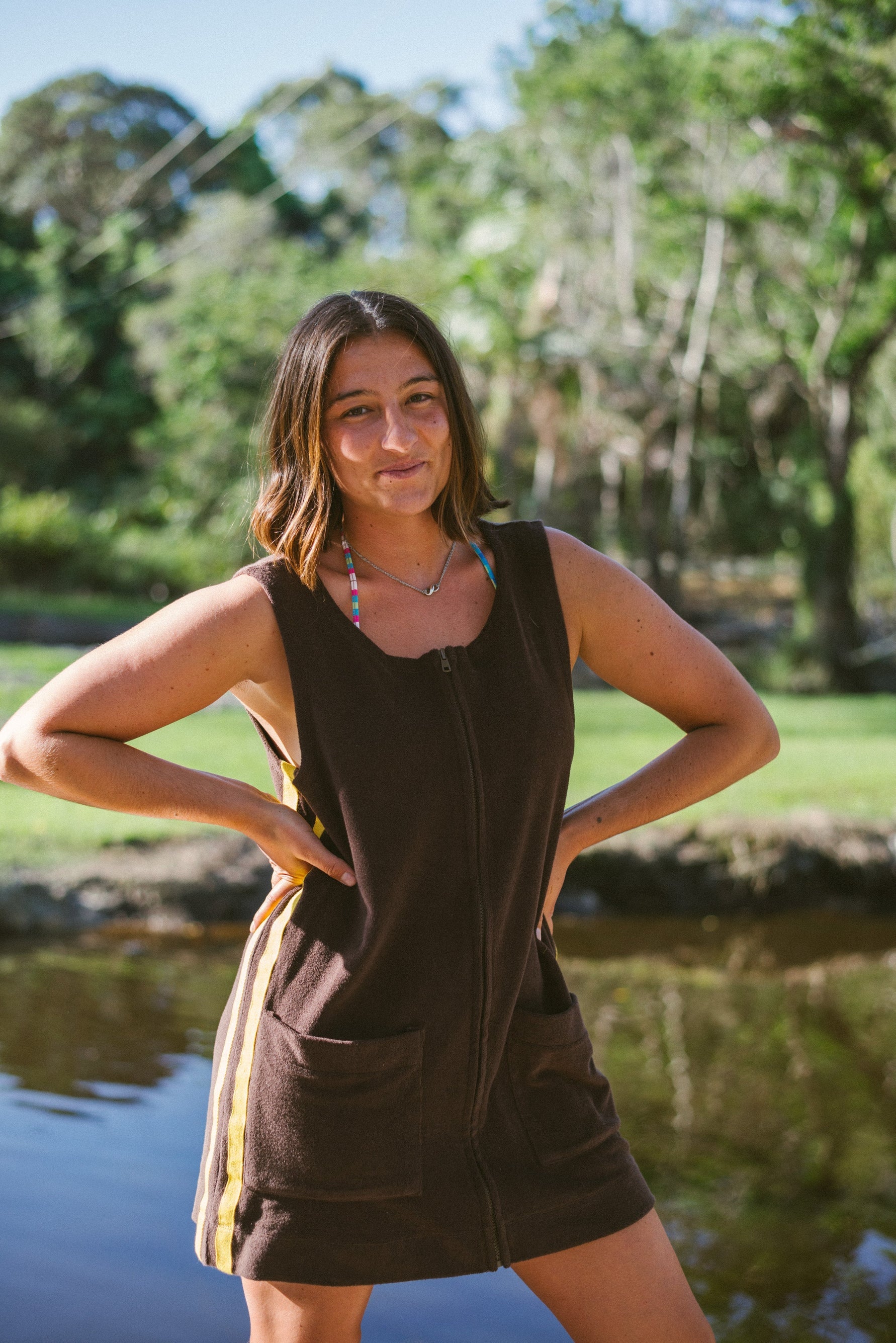 Made for beach days when you want something easy to throw on. Crafted from soft cotton terry towelling, it doubles as a post-surf dry-off and a summer dress in one. The front zip lets you wear it open or closed, while mango canvas stripes on the front pockets add a vintage-inspired kick. A go-to piece for slipping from waves to whatever’s next.