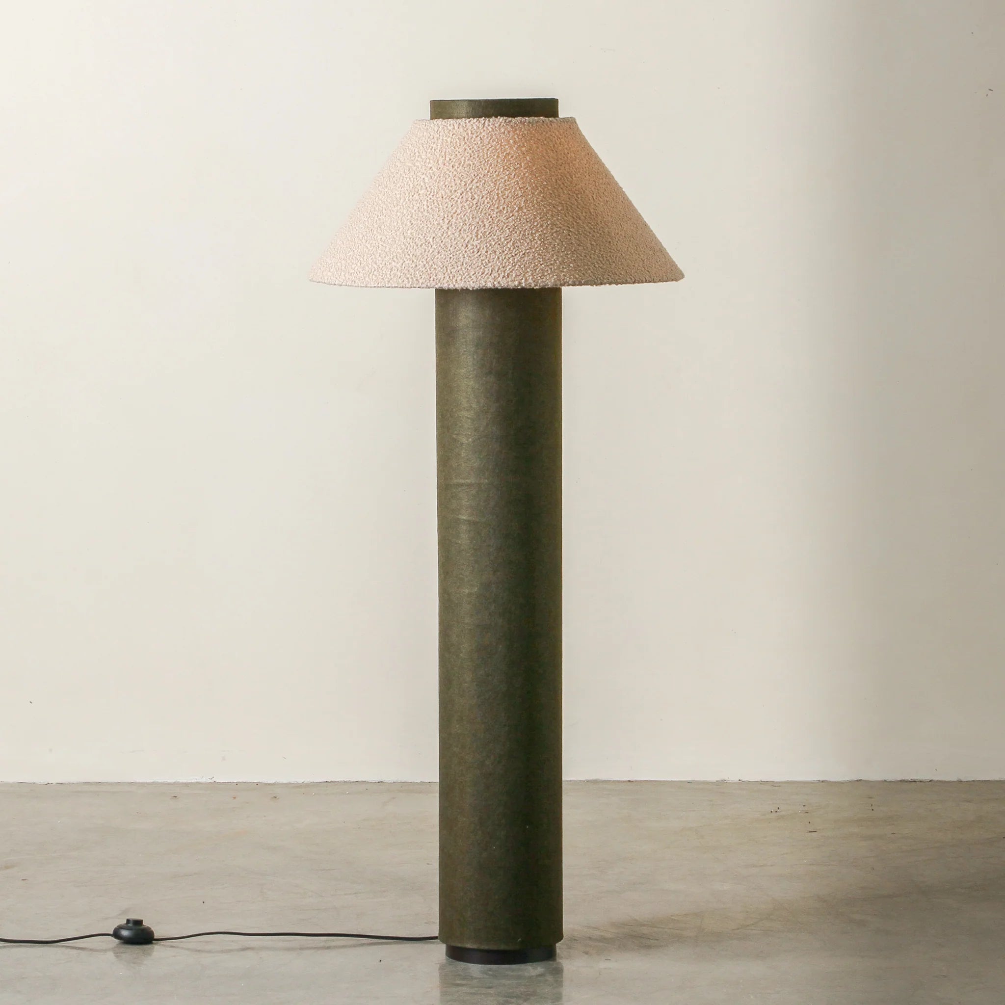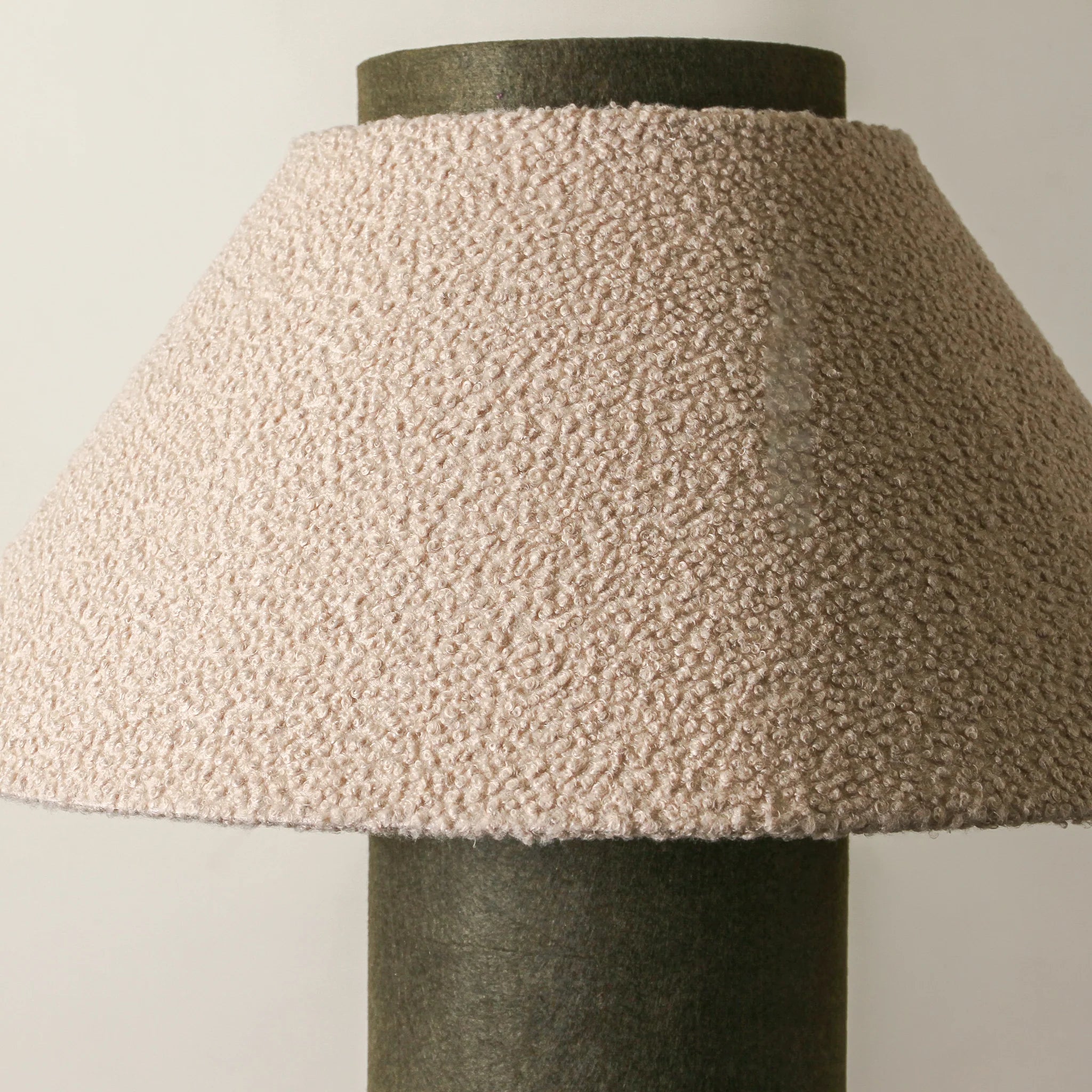 Bold yet serene, the Terrace Floor Lamp is built from contrast. A tall, cylindrical velvet base—available in Forest Green or Rose Dust—is paired with a tapered, boucle-textured shade in warm beige. The base offers rich, saturated colour and grounding weight, while the shade softens the silhouette with a tactile, organic edge. This piece embodies the vision of Tender Forms—functional design that behaves like sculpture. Terrace serves not just as lighting, but as a visual pillar within the room. Best positioned in corners, beside sofas or armchairs where height is needed. Style with low, textural furniture, and neutral materials like velvet, oak, or ceramic to allow the lamp’s form to anchor the space with intention.