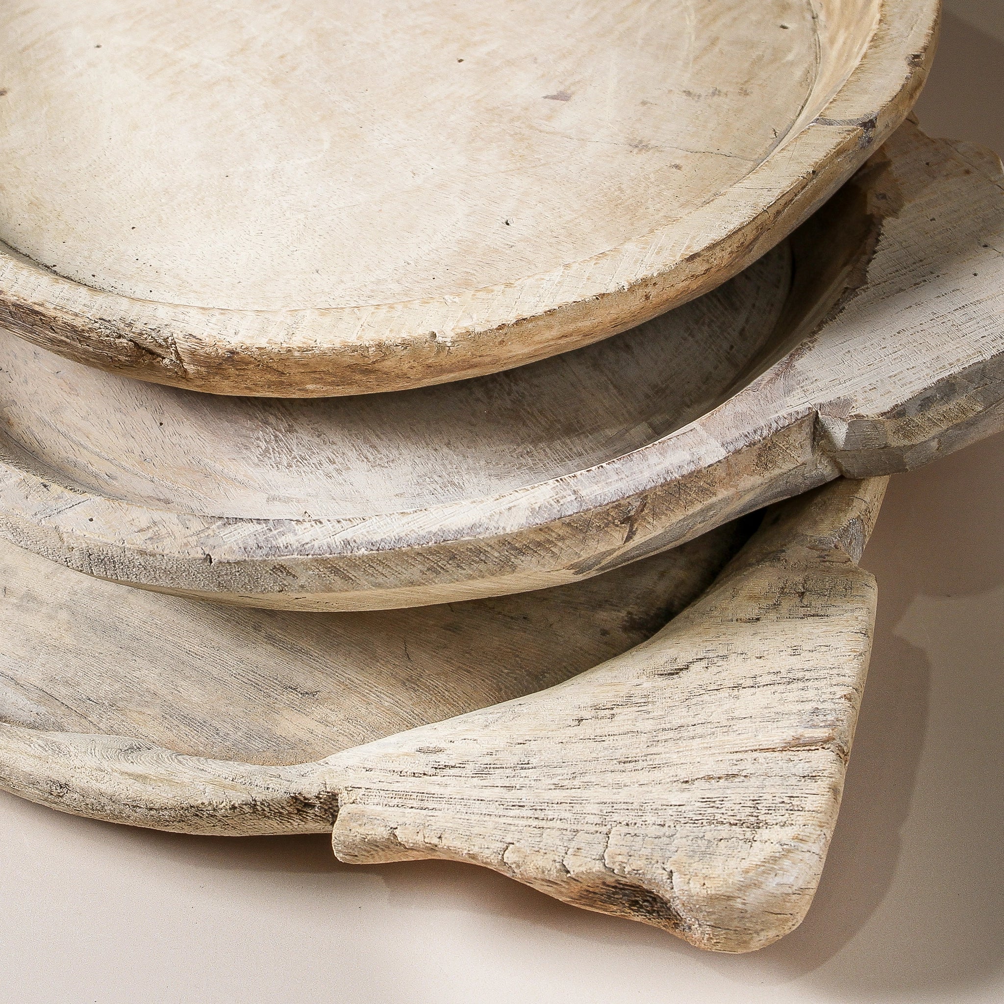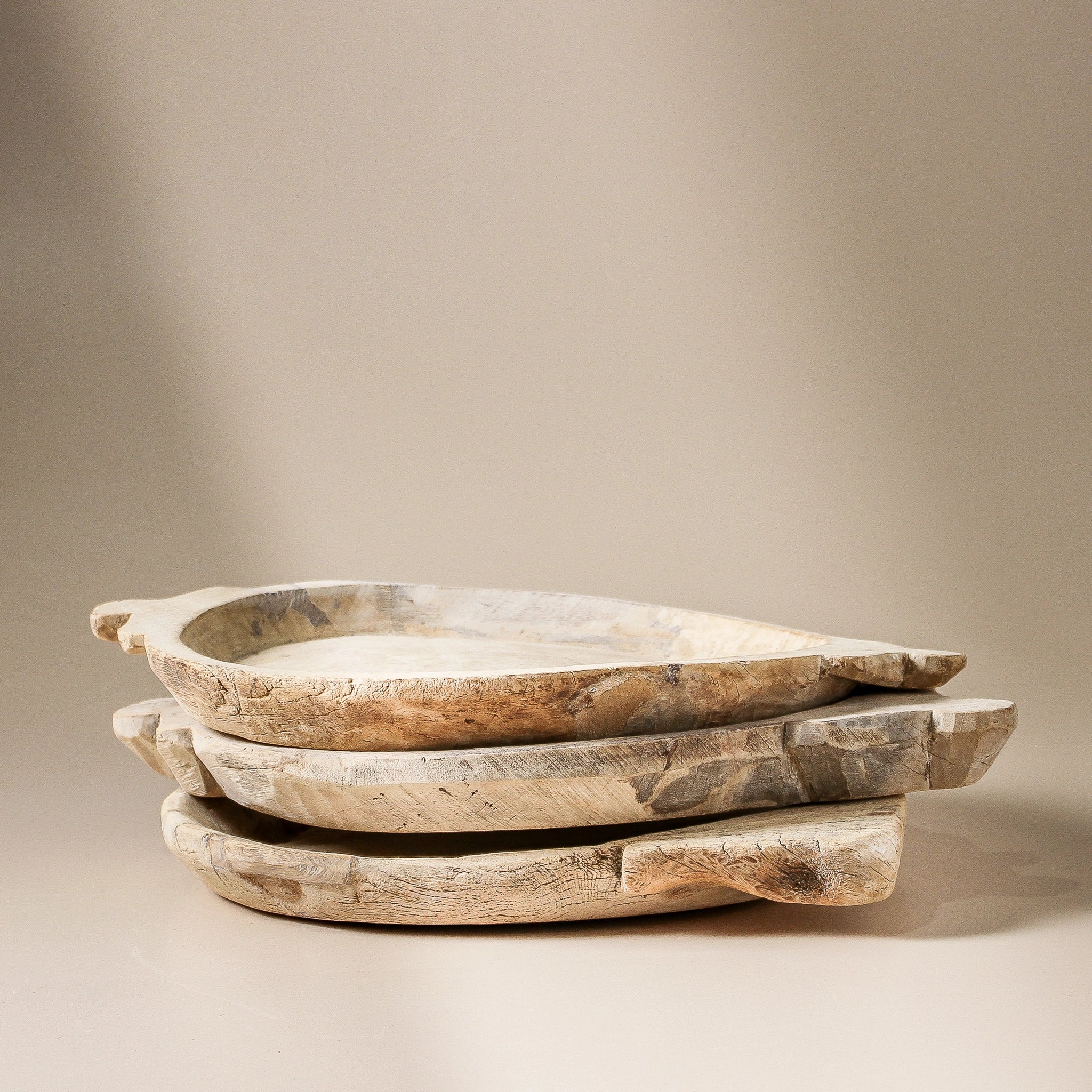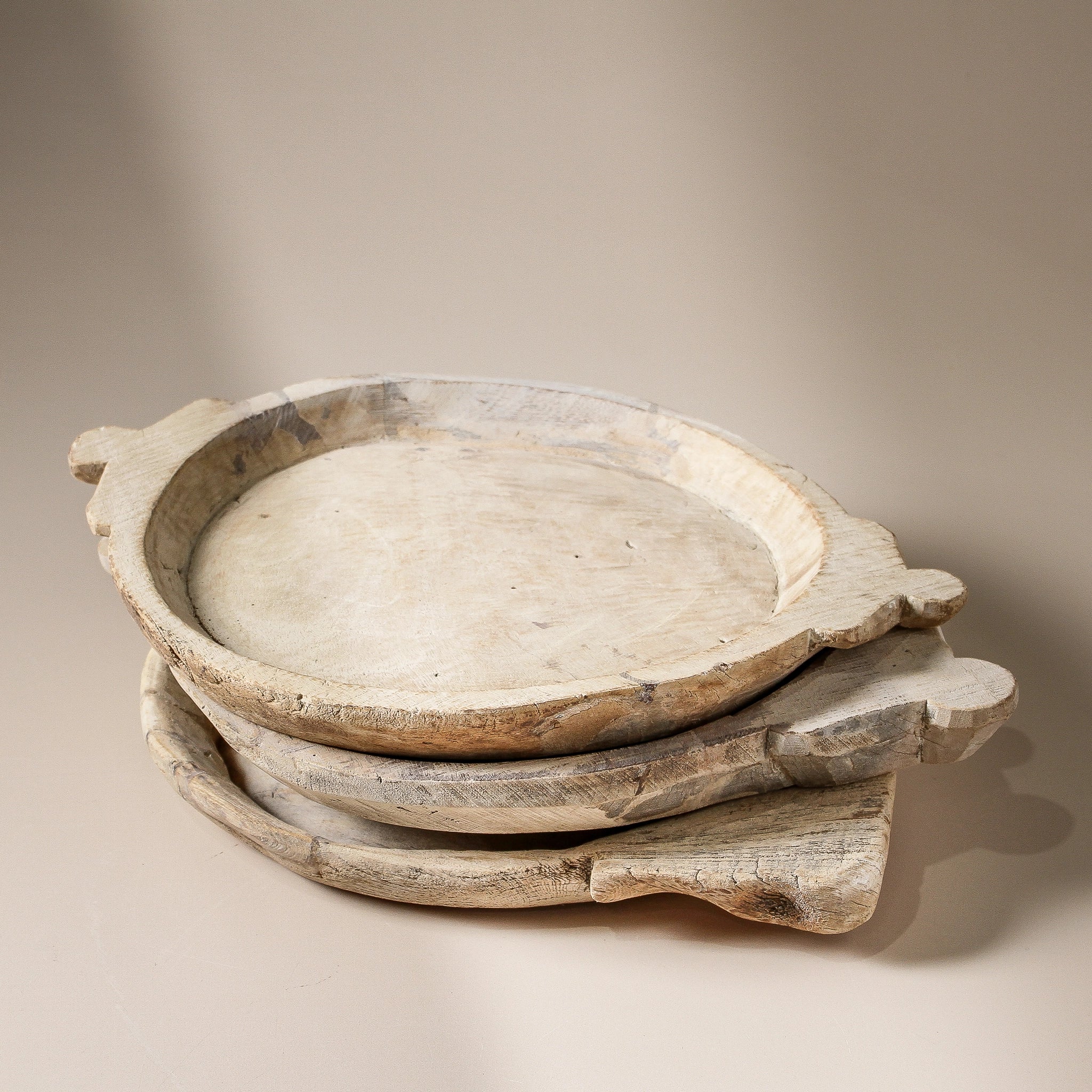 This vintage Indian parat from Rajasthan has been crafted from reclaimed wood and gently bleached, preserving the soft, worn beauty of its original surface. Once used in traditional Indian kitchens for preparing food, it carries the subtle marks of 60–80 years of history — smooth edges, gentle wear, and a timeworn charm that only comes with age.