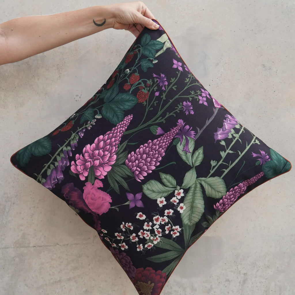 Inspired by the whimsical charm of English garden blooms, the Flourish Clover Cushion is made from durable, eco-friendly fabric made from recycled PET bottles and backed with our signature waterproof brown base. Intricate hand-drawn details in velvety, shadowy foliage to bold, life-filled florals.