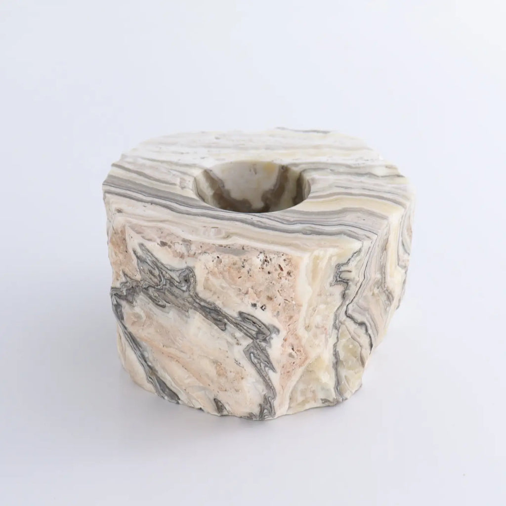 A striking piece of natural art — each zebra onyx candle holder is hand-carved from richly banded stone, its swirling layers of cream, sand, and deep espresso creating an earthy, elegant statement. When lit, the gentle glow filters through the translucent stone, revealing intricate patterns formed over centuries.